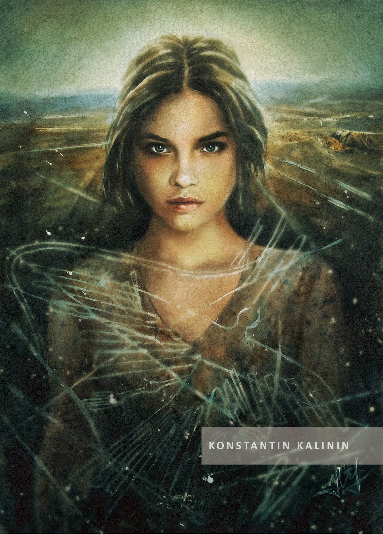 A vision suspended between past and future, this mesmerizing portrait captures a moment beyond time. The deep gaze of the girl holds the weight of forgotten histories and untold destinies, while ancient symbols seem to float across the canvas like whispers from another realm. Cracked textures and ethereal light add an aura of mystery, as if she exists in a dream or a distant memory.