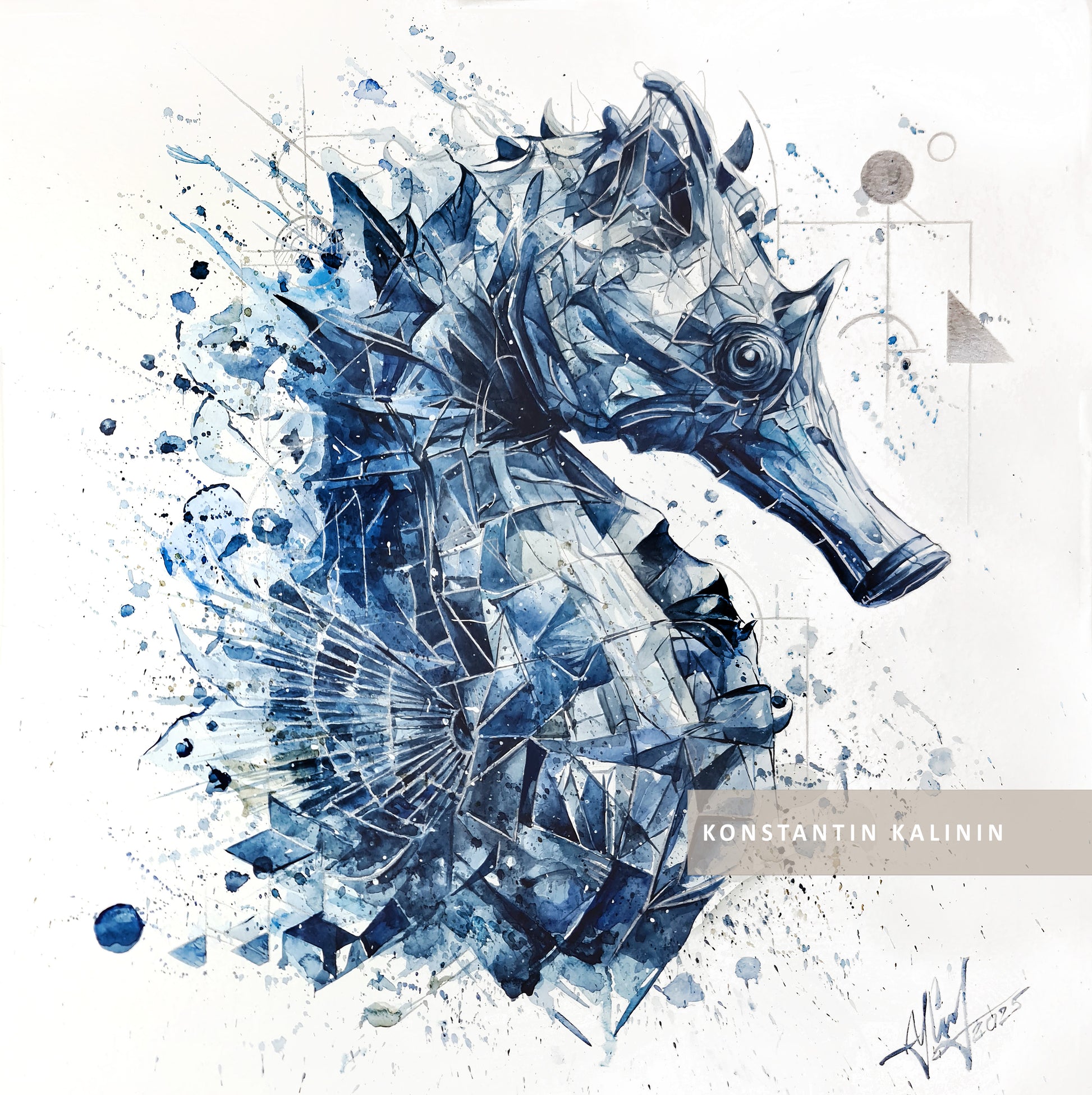 "FROM DEPTH TO LIGHT / The Seahorse Emerges" reveals the quiet mystery of the ocean’s soul. Painted in fluid watercolor tones with crystalline geometry and silver-blue depth, the seahorse rises from the abyss — fragile yet eternal, delicate yet powerful. Every line and shimmer of gold captures the balance between water and form, chaos and harmony.