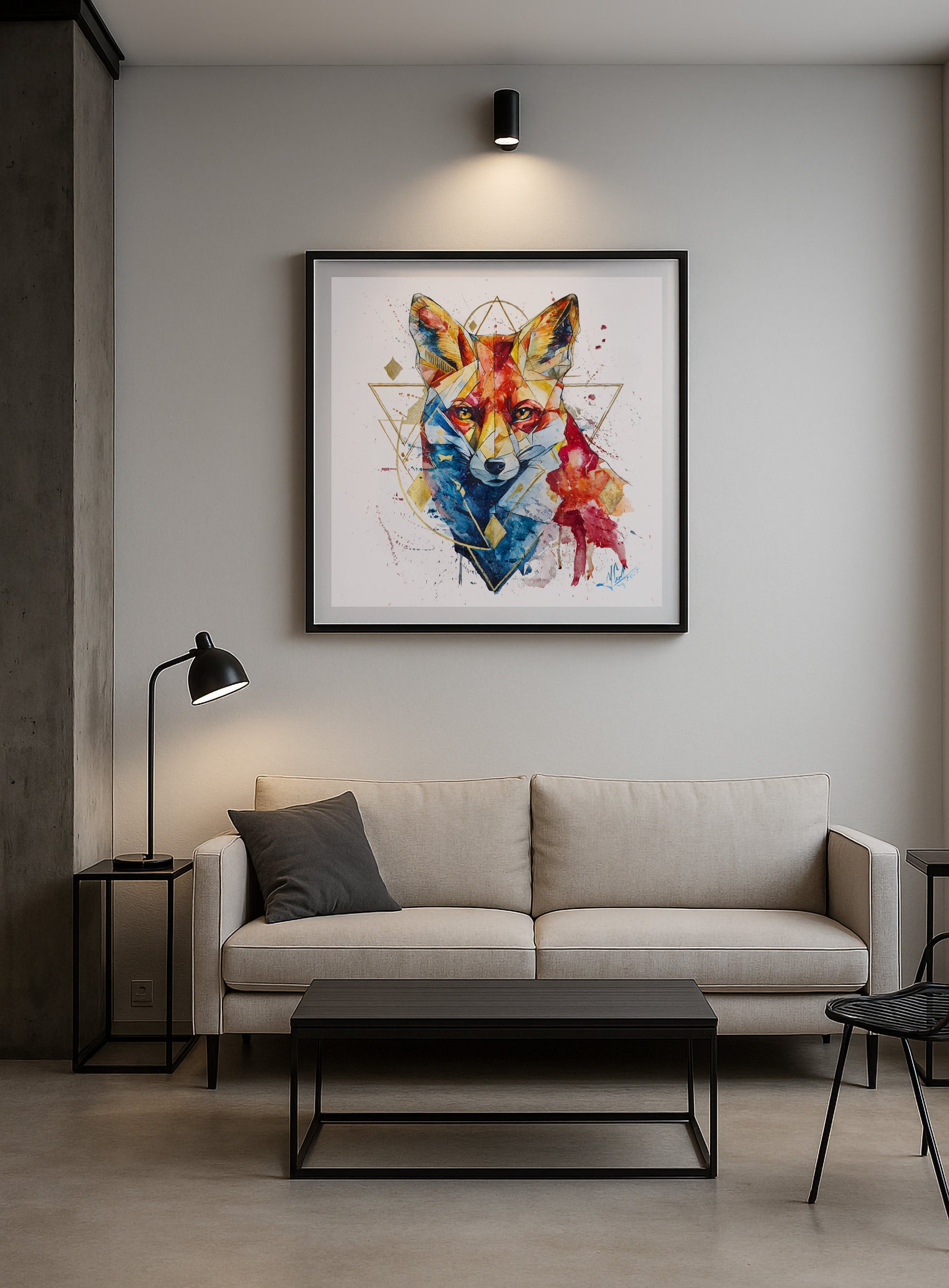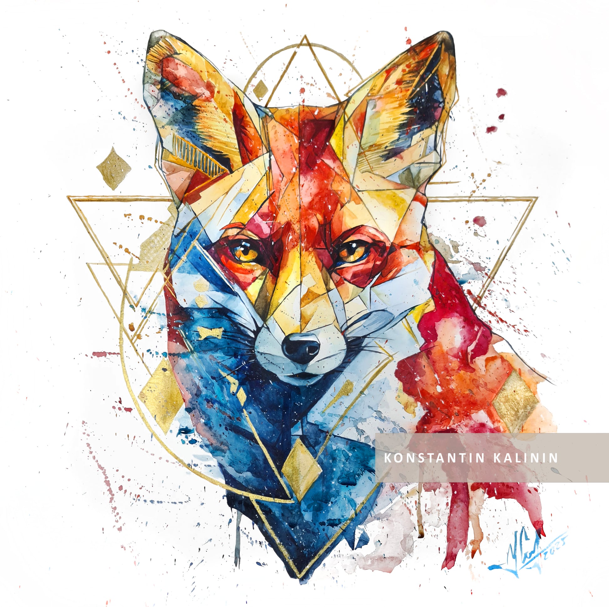 "FROM SILENCE TO LIFE / The Fox Appears" embodies the rebirth of spirit through color, form, and sacred geometry. Painted in expressive watercolor with golden accents, the fox emerges from silence into vivid existence — a symbol of intuition, cunning, and untamed freedom. Every sharp line and fluid wash creates harmony between chaos and order, stillness and vitality.